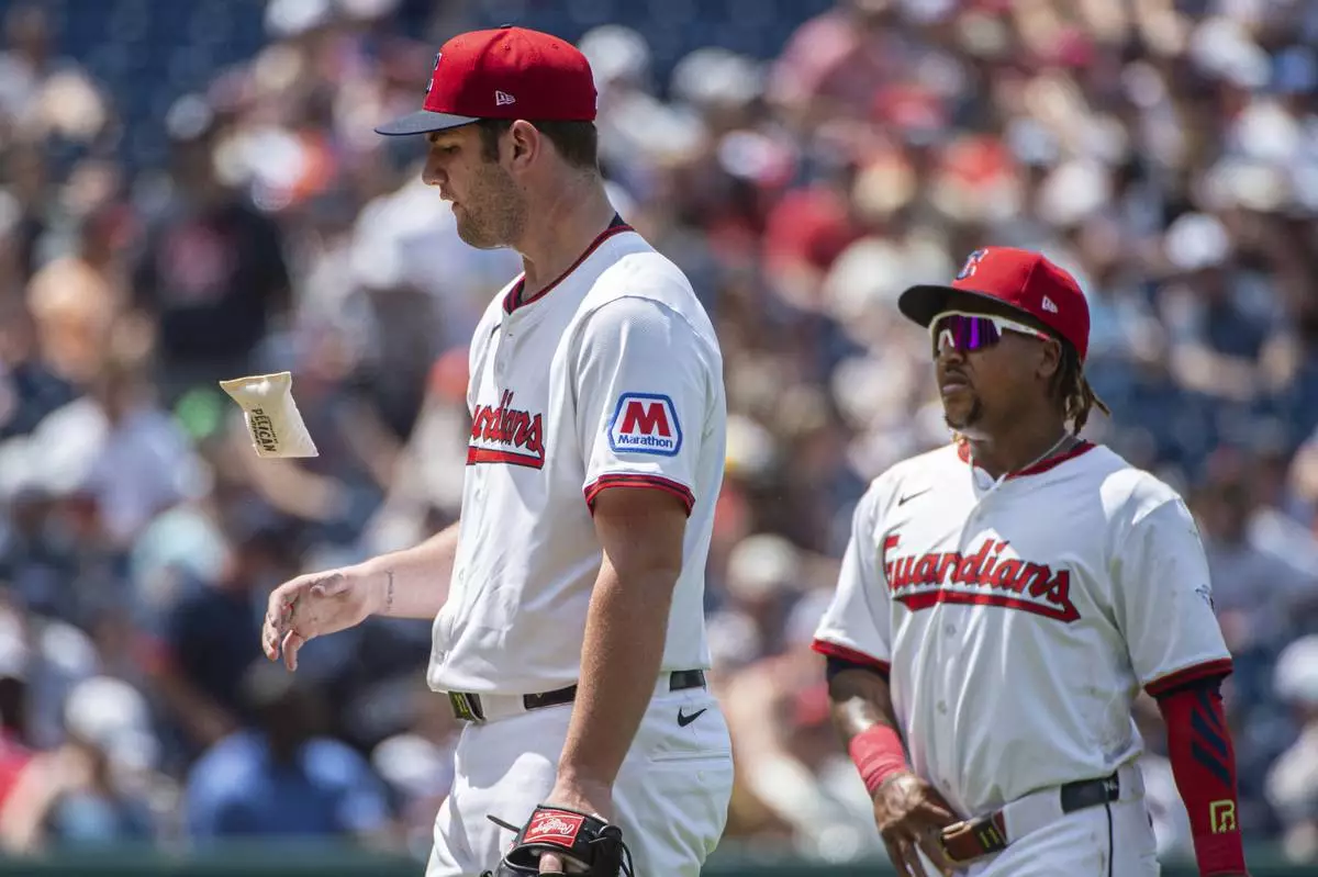 Cleveland Guardians starting pitcher Gavin Williams, left, flips a rosin bag as Jose Ramirez, right, looks on during the fifth inning of a baseball game against the Detroit Tigers, Sunday, July 6, 2025, in Cleveland. (AP Photo/Phil Long)