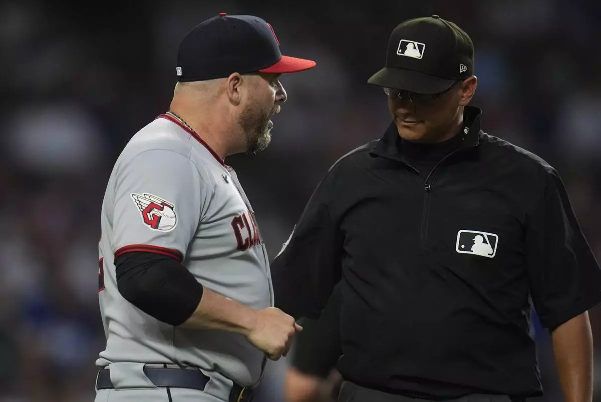 Cleveland Guardians manager Stephen Vogt (12), left, discusses a call with umpire Vic Carapazza (19) during the fourth inning of a baseball game against the Chicago Cubs, Wednesday, July 2, 2025, in Chicago. (AP Photo/Erin Hooley)