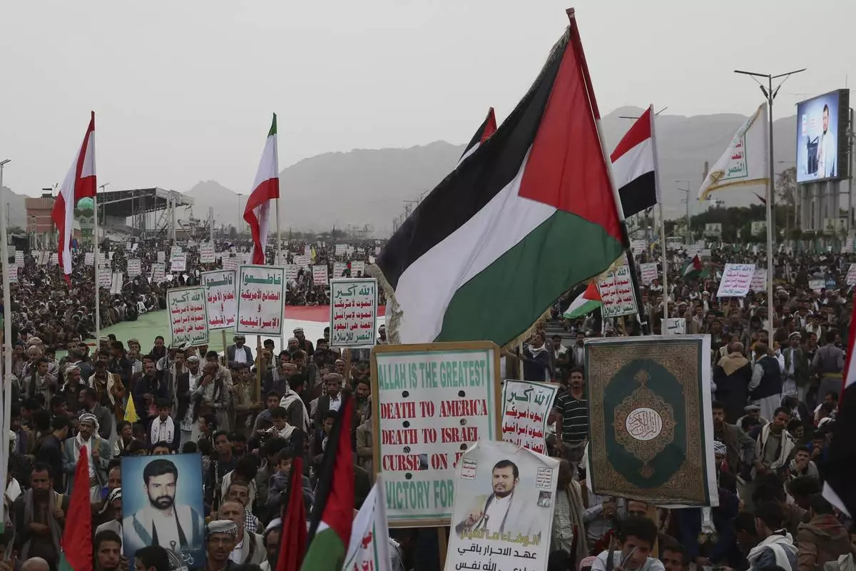 Houthi supporters shout slogans during an anti-U.S. and anti-Israel weekly rally in Sanaa, Yemen, Friday, July 4, 2025. (AP Photo/Osamah Abdulrahman)