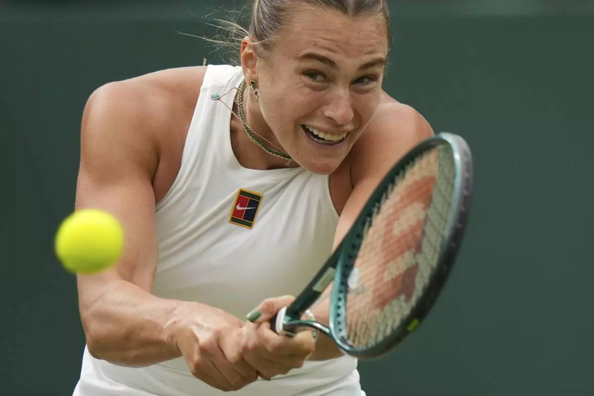 Aryna Sabalenka of Belarus returns to Belgium's Elise Mertens during a fourth round women's singles match at the Wimbledon Tennis Championships in London, Sunday, July 6, 2025. (AP Photo/Alastair Grant)