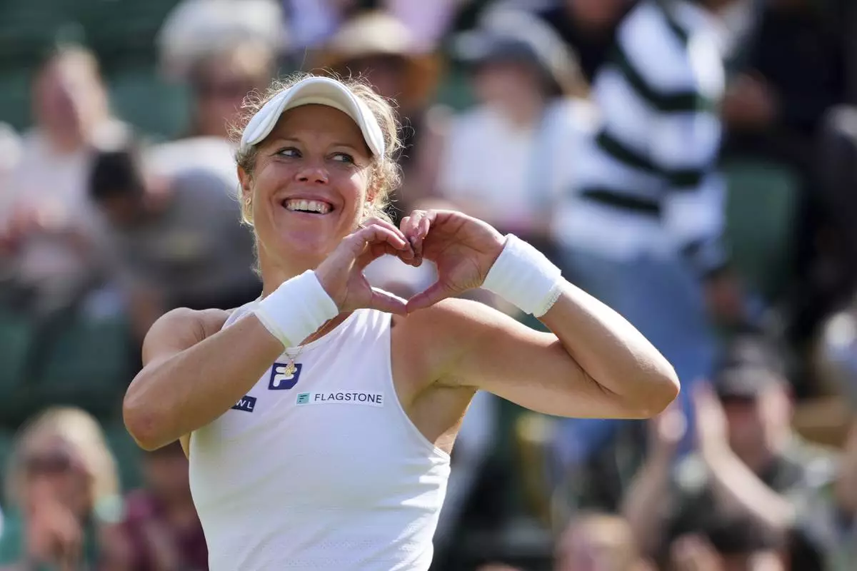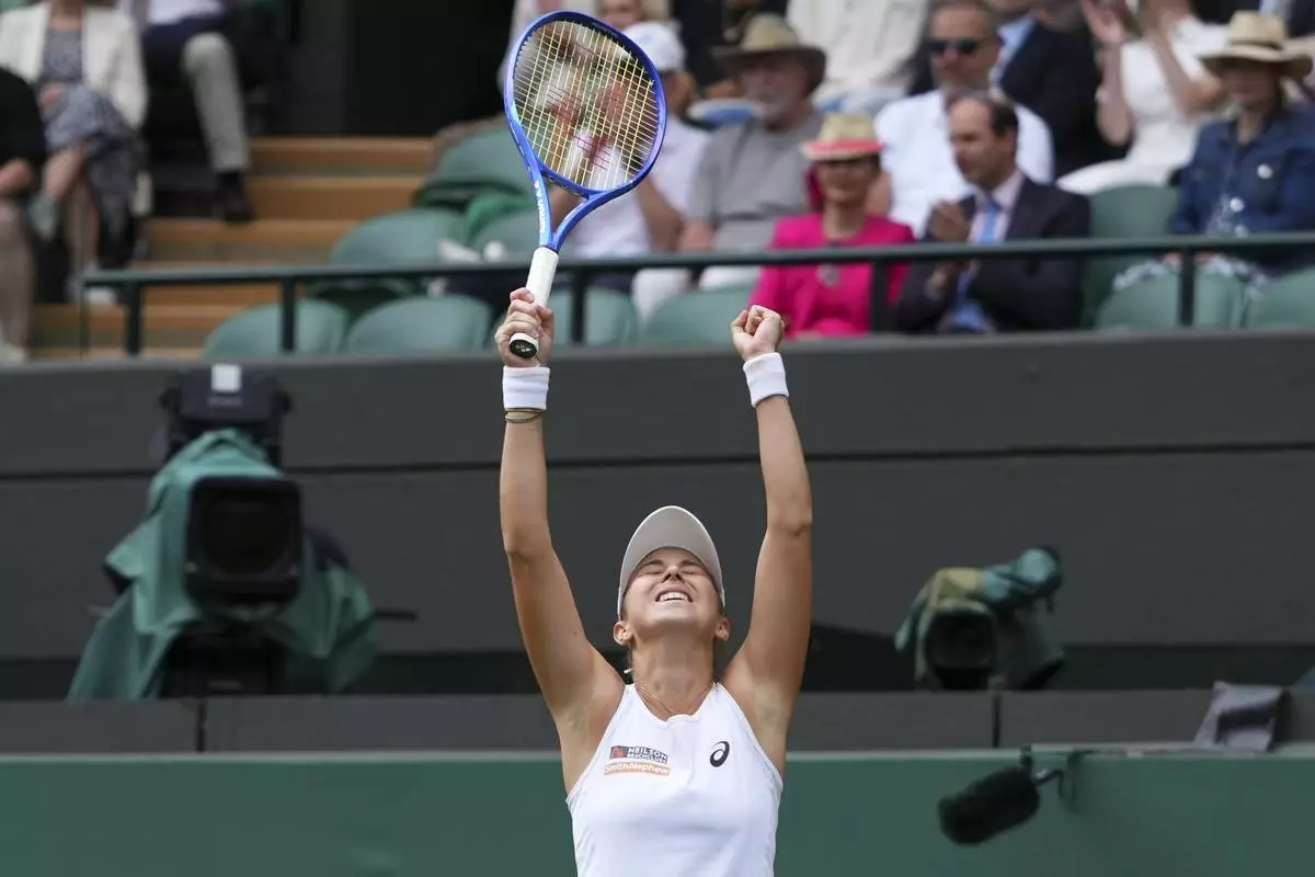 Laura Siegmund of Germany celebrates winning her women's singles fourth round match against Solana Sierra of Argentina at the Wimbledon Tennis Championships in London, Sunday, July 6, 2025.(AP Photo/Kirsty Wigglesworth)