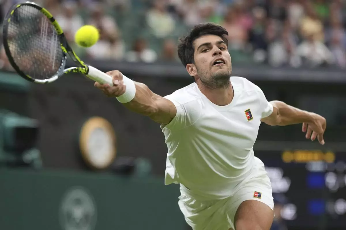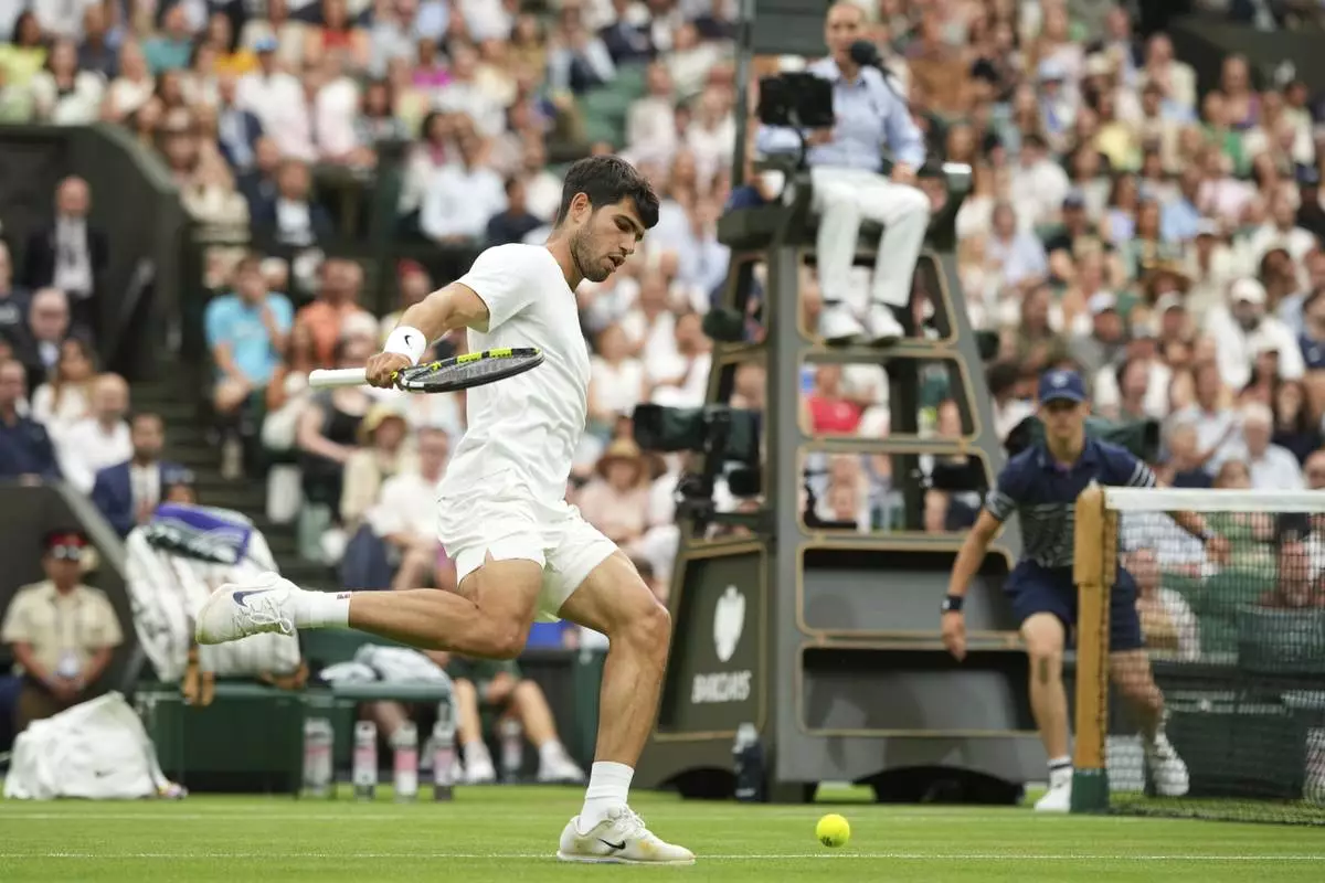 Spain's Carlos Alcaraz returns to Russia's Andrey Rublev during a fourth round men's singles match at the Wimbledon Tennis Championships in London, Sunday, July 6, 2025. (AP Photo/Alastair Grant)