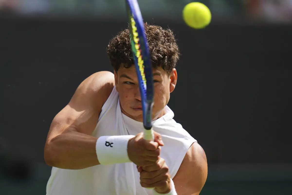 Ben Shelton of the U.S. plays a return to Lorenzo Sonego of Italy during the men's singles fourth round match at the Wimbledon Tennis Championships in London, Monday, July 7, 2025.(AP Photo/Kirsty Wigglesworth)