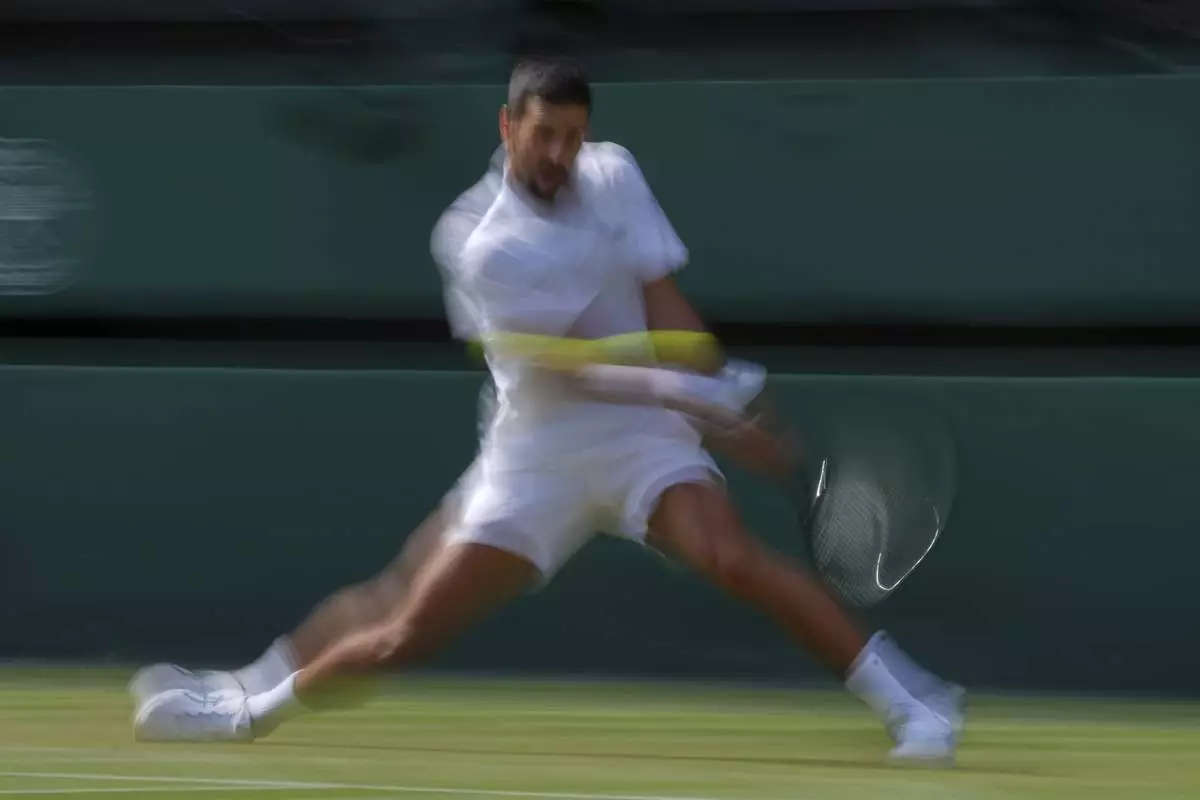 Serbia's Novak Djokovic returns to Australia's Alex de Minaur during a fourth round men's singles match at the Wimbledon Tennis Championships in London, Monday, July 7, 2025. (AP Photo/Kin Cheung)