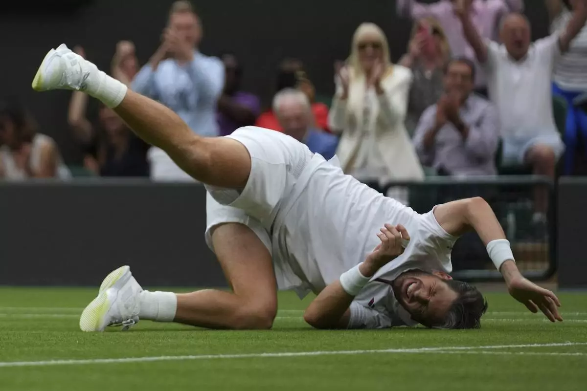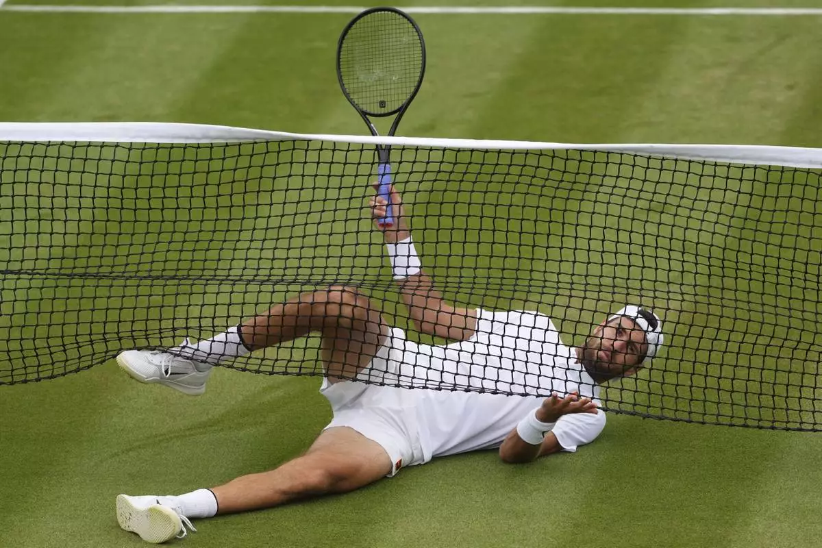 Karen Khachanov of Russia slides under the netting during his men's singles fourth round match against Kamil Majchrzak of Poland at the Wimbledon Tennis Championships in London, Sunday, July 6, 2025.(AP Photo/Kirsty Wigglesworth)