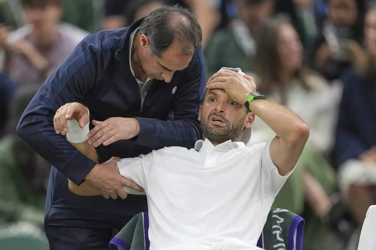 Bulgaria's Grigor Dimitrov gets treatment after he went down with an injury which forced him to retire injured from a fourth round men's singles match against Italy's Jannik Sinner at the Wimbledon Tennis Championships in London, Monday, July 7, 2025. (AP Photo/Kin Cheung)