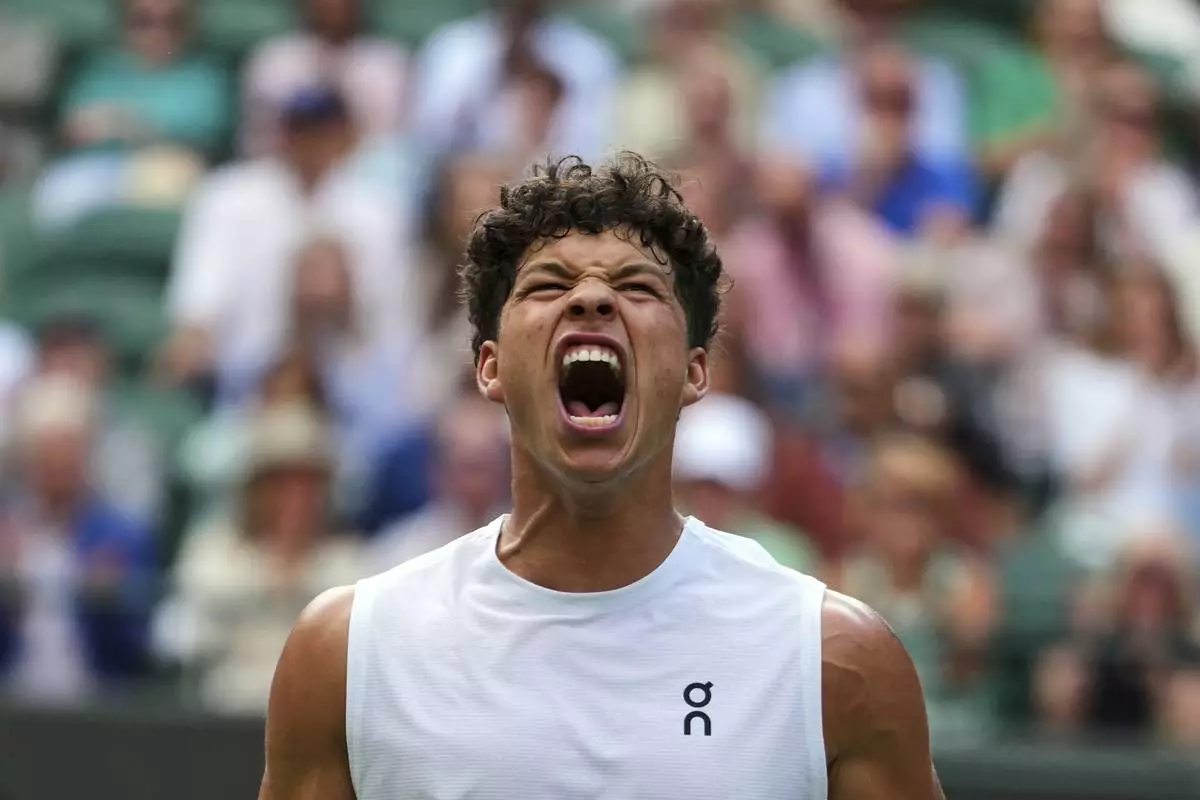 Ben Shelton of the U.S. reacts during the men's singles fourth round match against Lorenzo Sonego of Italy at the Wimbledon Tennis Championships in London, Monday, July 7, 2025.(AP Photo/Kirsty Wigglesworth)