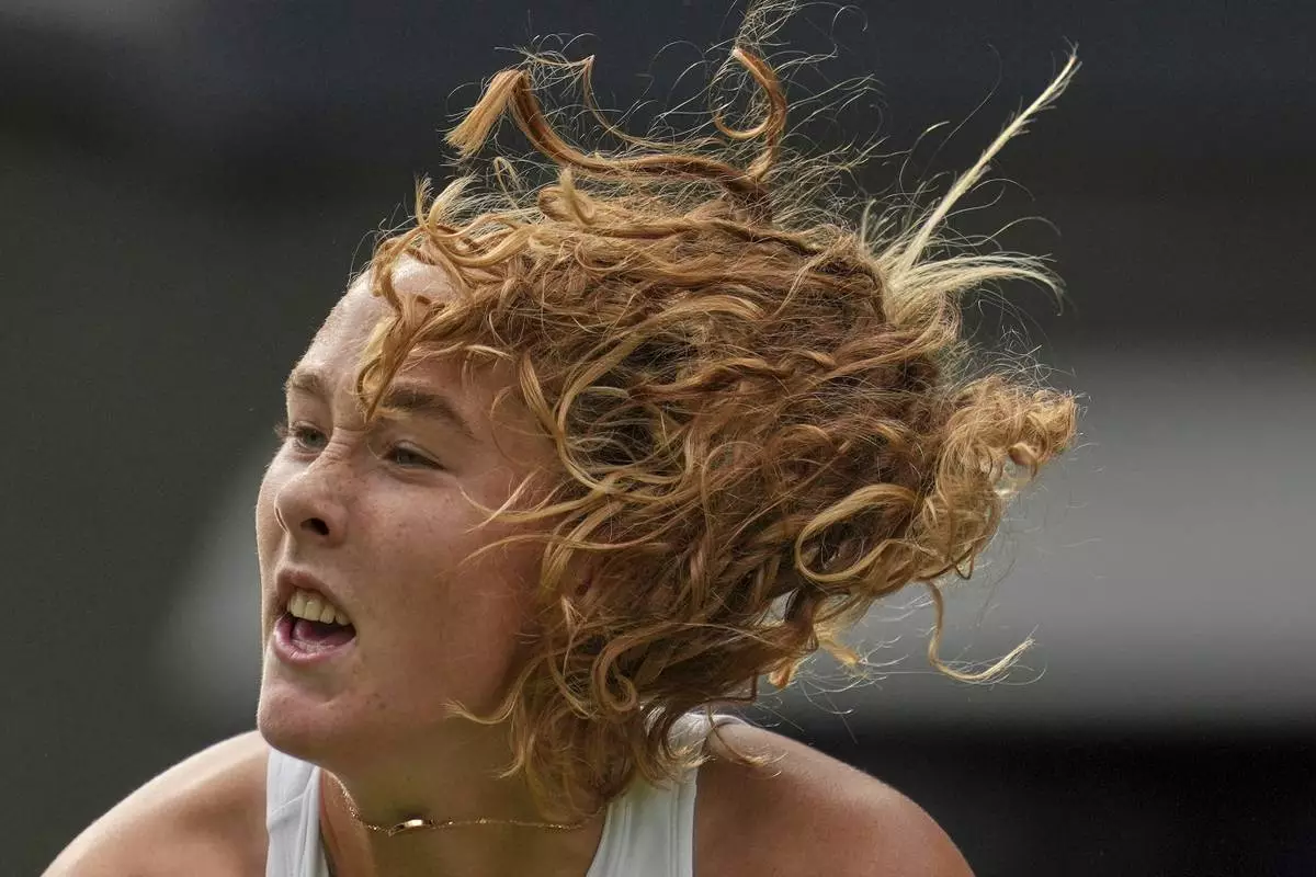 Mirra Andreeva of Russia serves to Emma Navarro of the U.S. during a fourth round women's singles match at the Wimbledon Tennis Championships in London, Monday, July 7, 2025. (AP Photo/Kin Cheung)