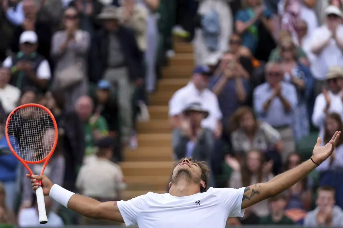 Flavio Cobolli of Italy celebrates winning his men's singles fourth round match against Marin Cilic of Croatia at the Wimbledon Tennis Championships in London, Monday, July 7, 2025.(AP Photo/Joanna Chan)
