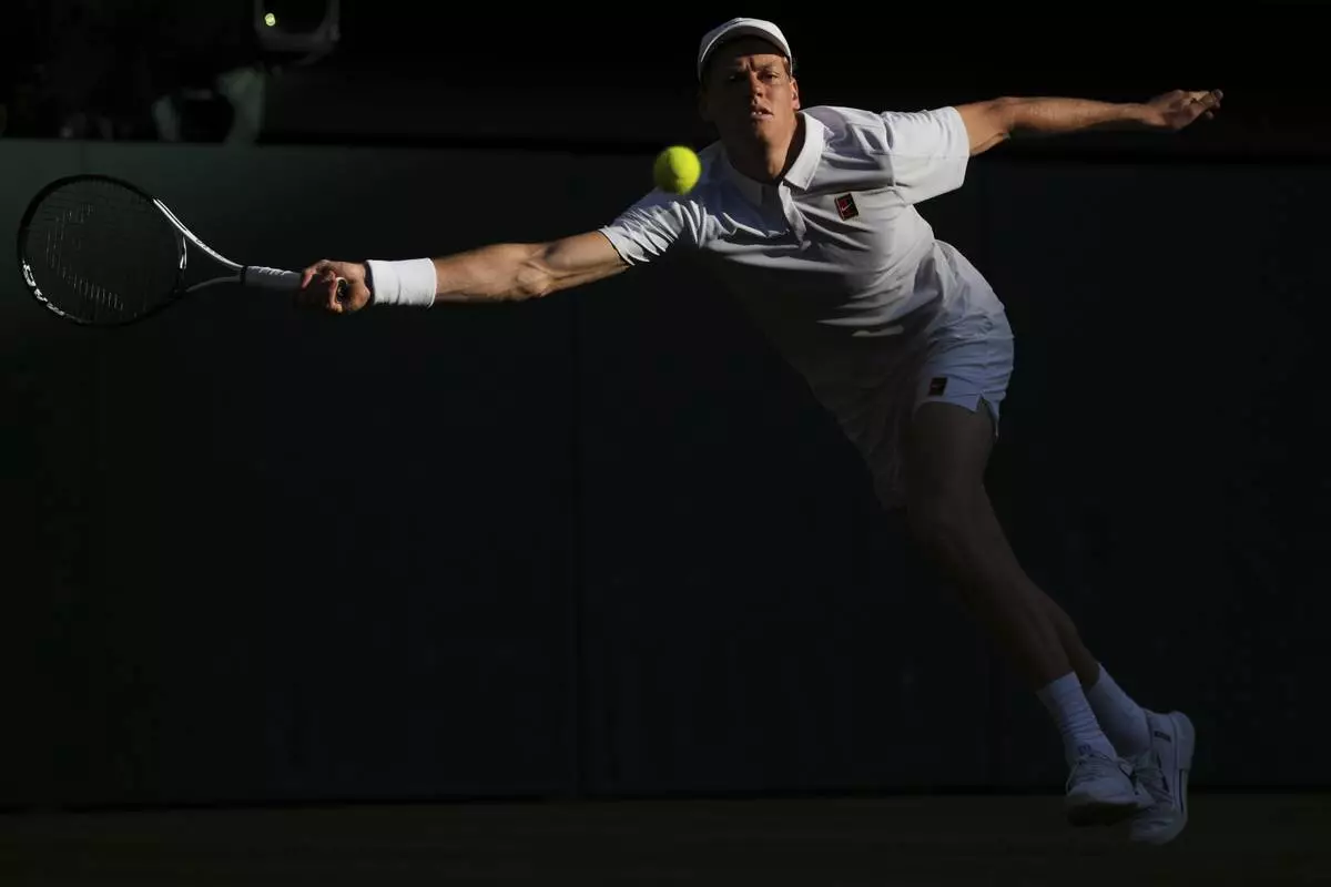 Taylor Fritz of the U.S. plays a return to Jordan Thompson of Australia during their men's singles fourth round match at the Wimbledon Tennis Championships in London, Sunday, July 6, 2025.(AP Photo/Joanna Chan)