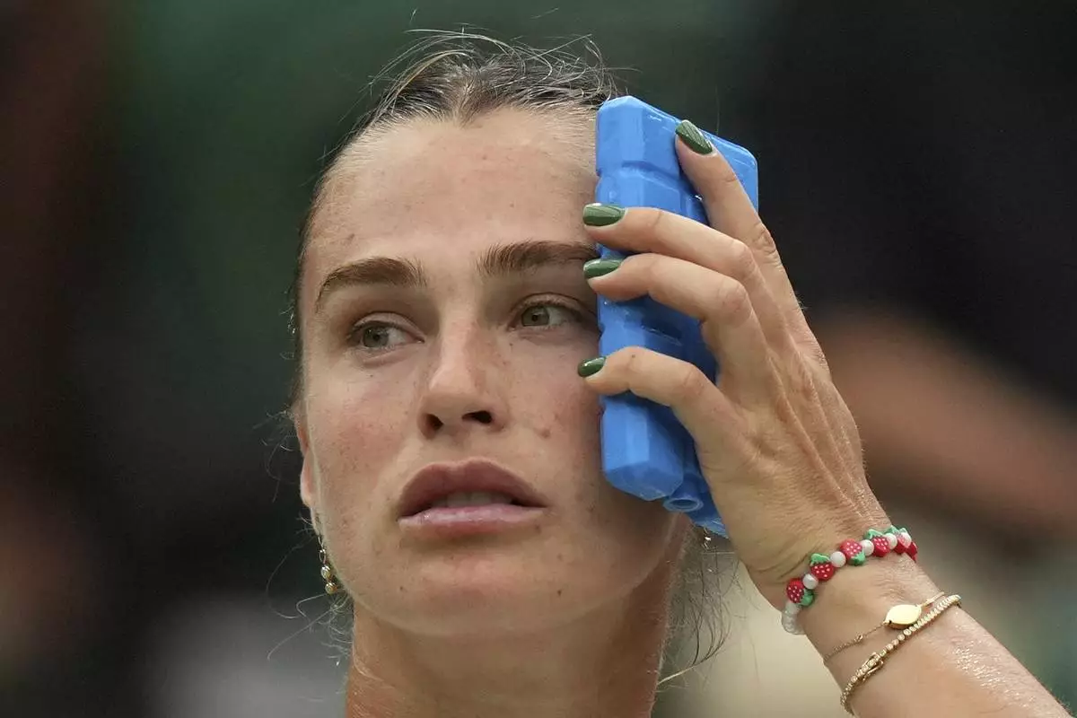Aryna Sabalenka of Belarus uses an ice pack to keep cool during a change of ends break as she plays Belgium's Elise Mertens during a fourth round women's singles match at the Wimbledon Tennis Championships in London, Sunday, July 6, 2025. (AP Photo/Alastair Grant)