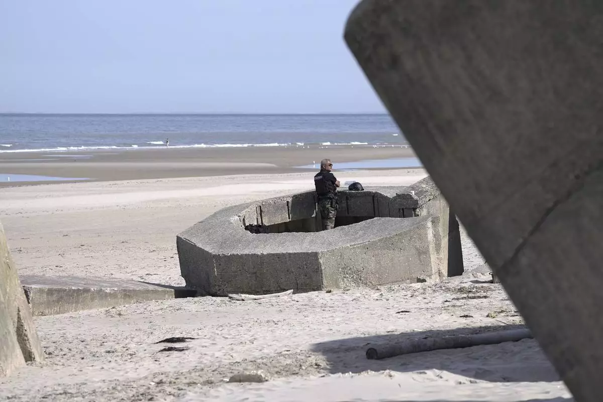 A gendarme stands in a WWII nazi bunker at Ecault beach, Friday July 4, 2025. (AP Photo/John Leicester)