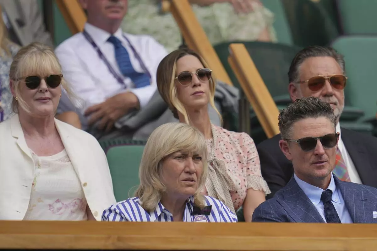 Actor Sarah Lancashire, Deborah Jevans, Britney Theriot, golfer Justin Rose and actor Russell Crowe, from left, sit in the Royal Box on Centre Court on day two at the Wimbledon Tennis Championships in London, Tuesday, July 1, 2025. (AP Photo/Kin Cheung)
