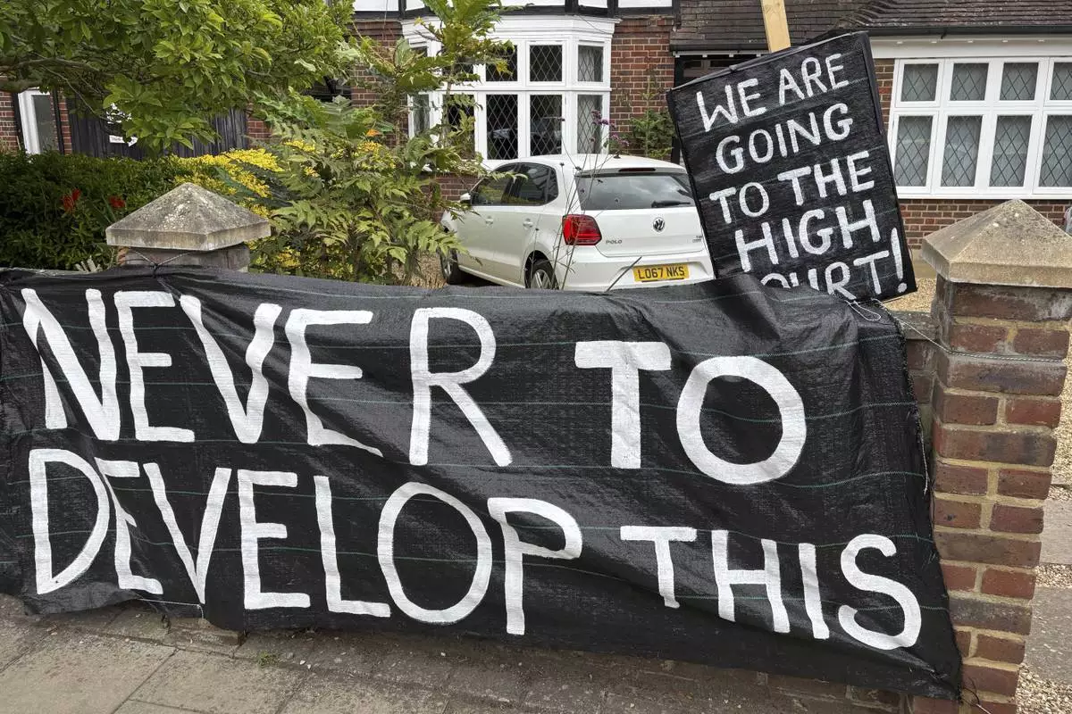 A banner opposed to Wimbledon's major expansion plan is placed outside a house leading to the All England Club where the Wimbledon Tennis Championships take place in London, Saturday, July 5, 2025. (AP Photo/Tony Hicks)
