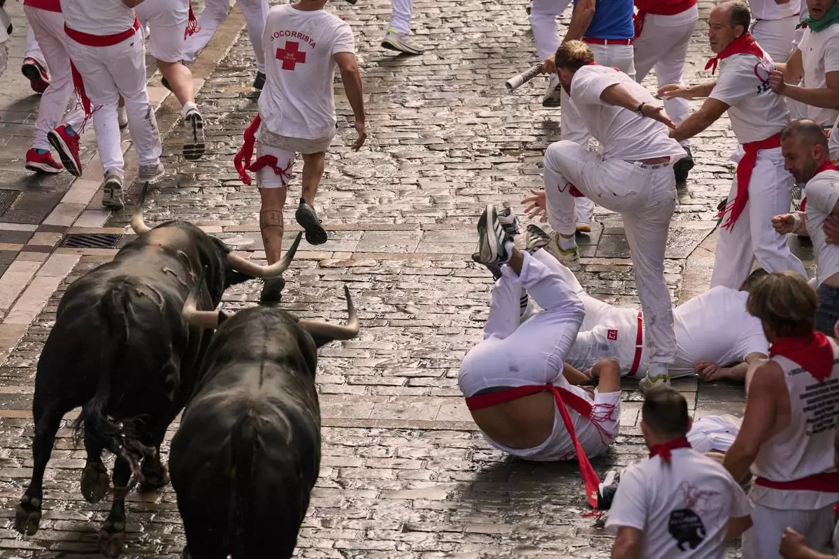 The festival isn't without its detractors. On Saturday, animal rights activists marched through Pamplona wearing horns and splotched with fake blood in protest against the San Fermin bull runs. Some held up signs saying “bullfights are a sin.”