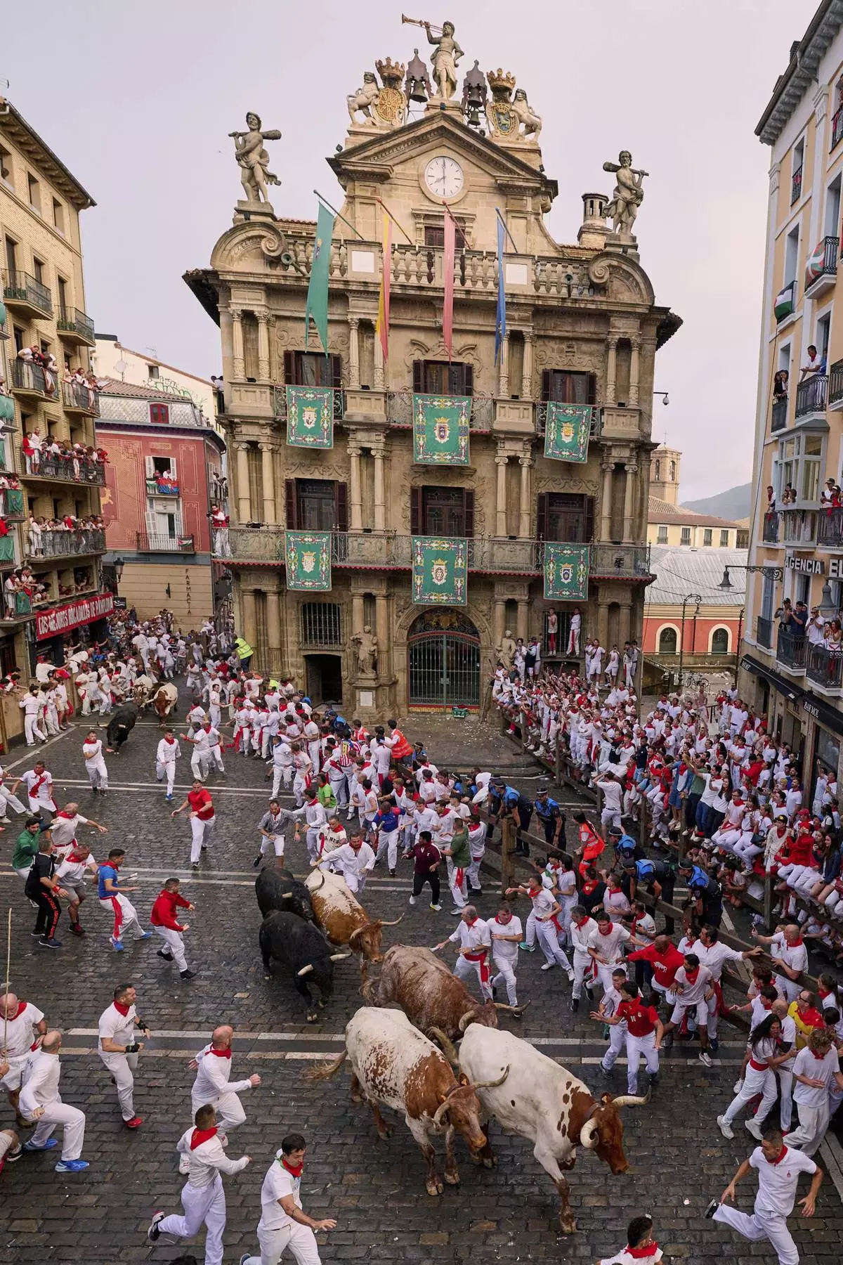 The bulls pounded along the twisting cobblestone streets after being led by six steers. Up to 4,000 runners take part in each bull run, which takes place over 846 meters (2,775 feet) and can last two to four minutes.