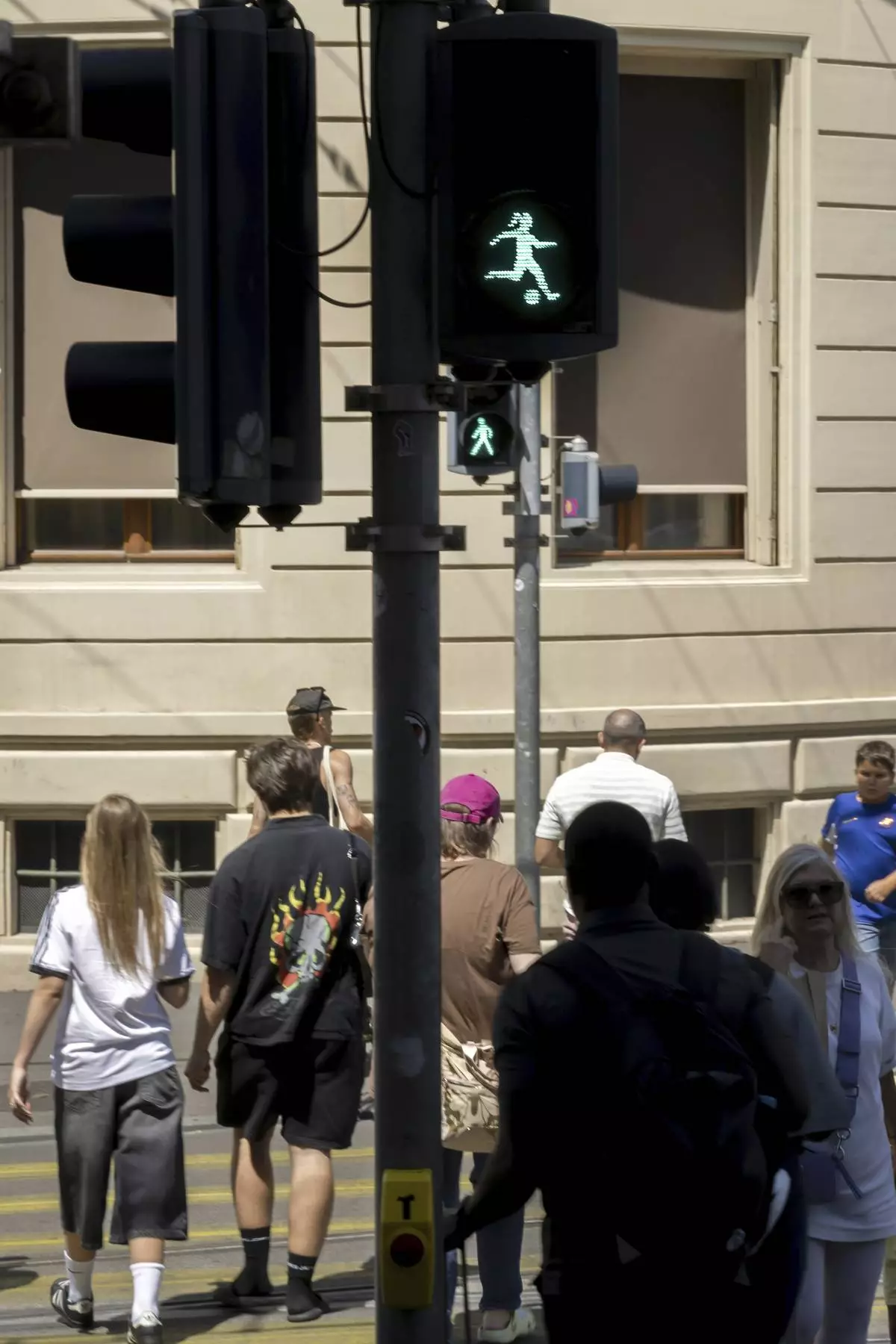 BASEL, Switzerland (AP) — Law-abiding pedestrians wait for the green woman kicking a soccer ball before they cross the road during the Women’s European Championship.