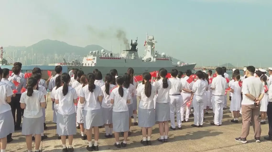 Early that morning, locals and student representatives gathered at the dock of the PLA Hong Kong Garrison's naval base in Stonecutters Island, where the Zhanjiang missile destroyer and the Yuncheng missile frigate were prepared for departure. In the vibrant waters of Victoria Harbor, the aircraft carrier Shandong and the Yan'an missile destroyer displayed signal flags stating "Thanks for your support" and "Serving the people."