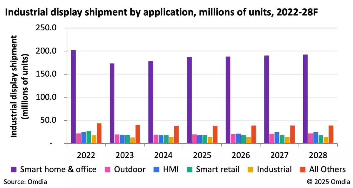 Industrial display shipment by application, millions of units, 2022-28F