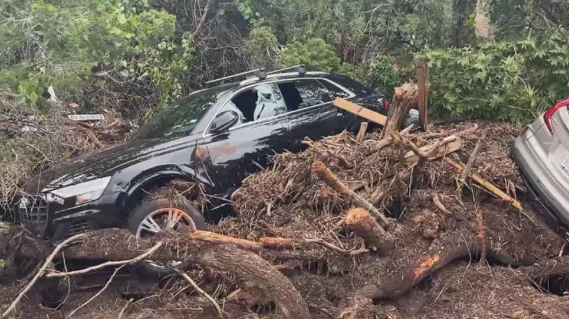 Local residents and authorities are grappling with the catastrophic aftermath, as the landscape is littered with uprooted trees, debris, and mud, all jumbled into chaotic heaps.