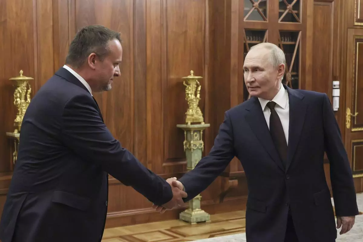 Russian President Vladimir Putin, right, shakes hands with a newly appointed acting Transport Minister Andrey Nikitin during their meeting at the Kremlin in Moscow, Russia, Monday, July 7, 2025. (Mikhail Metzel, Sputnik, Kremlin Pool Photo via AP)