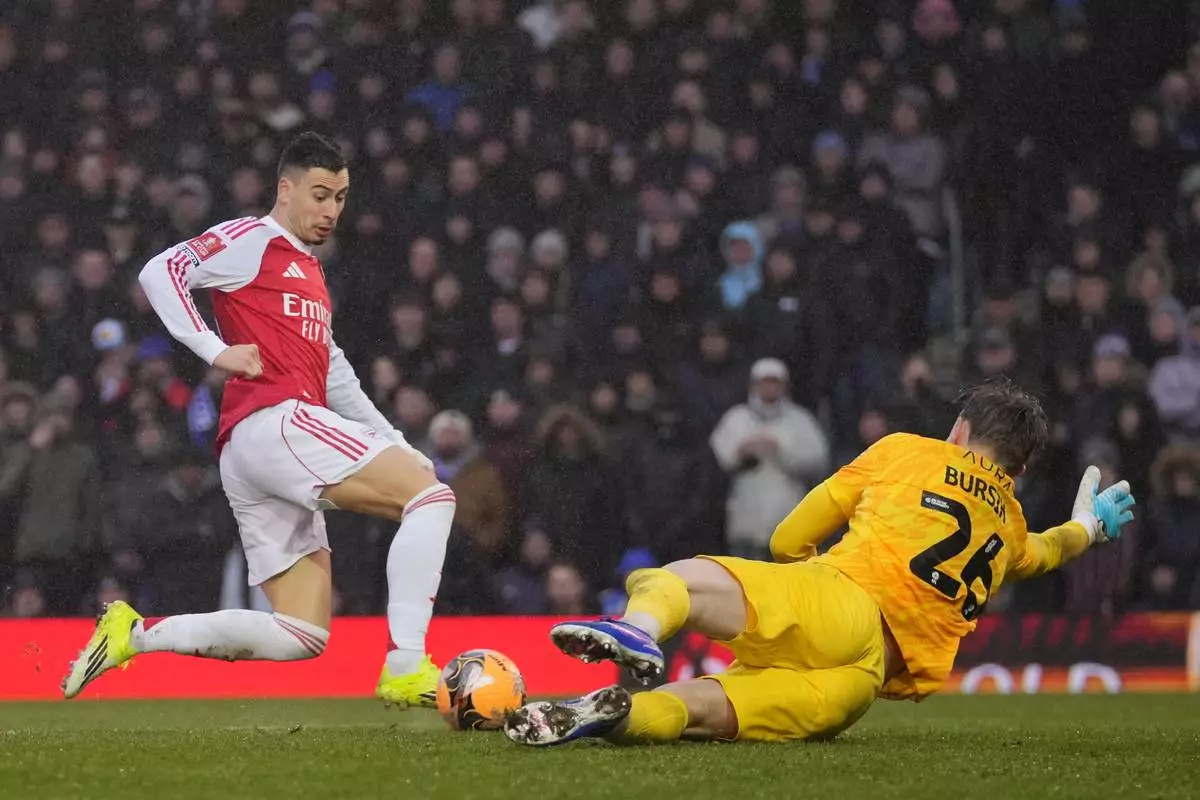 Arsenal's Gabriel Martinelli scores during the FA Cup third round soccer match between Portsmouth and Arsenal in Portsmouth, England, Sunday, Jan. 11, 2026. (AP Photo/Kin Cheung)
