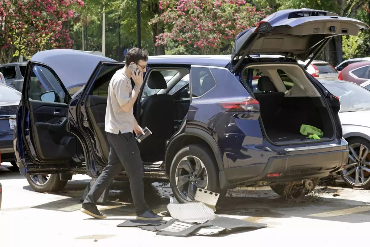 A man tries to dry his car out in a parking lot at University Place shopping center after it was flooded out during tropical storm Chantal, Monday, July 7, 2025, in Chapel Hill, N.C. (AP Photo/Chris Seward)