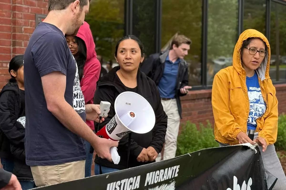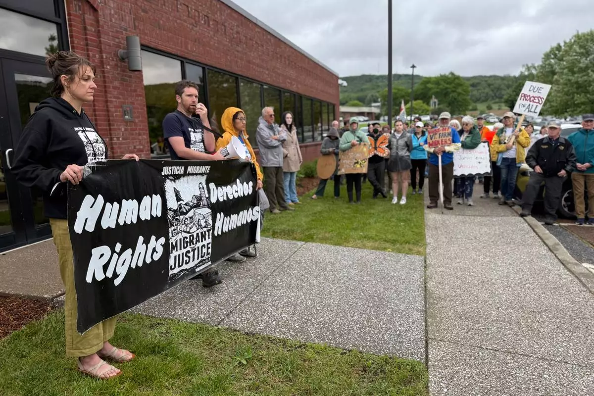 Protesters hold a rally outside a U.S. Immigration and Customs Enforcement office in St. Albans, Vt., on Friday, June 20, 2025, in support of Wuendy Bernardo, a migrant dairy farmworker at risk of deportation. (AP Photo/Amanda Swinhart)