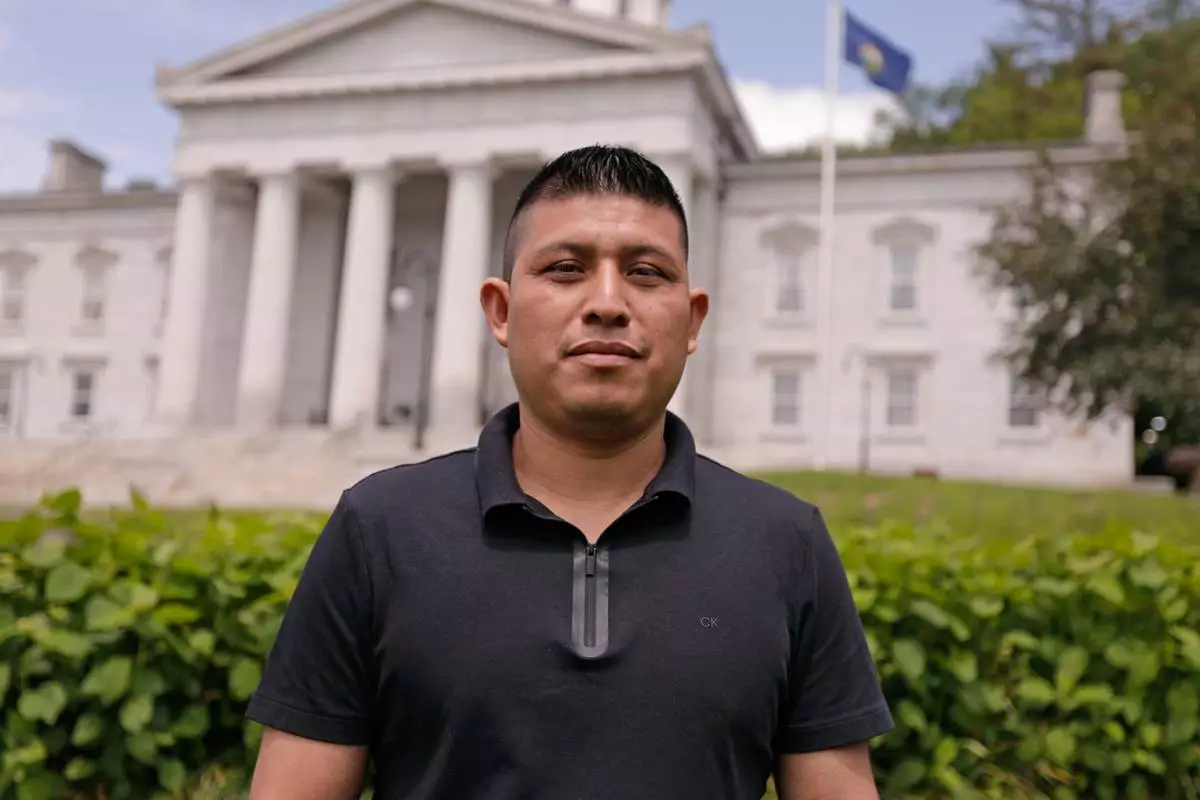 Dairy farmworker José Molina-Aguilar stands outside the Vermont Statehouse after a rally for housing rights for migrant farmworkers in Montpelier, Vt., on Friday, June 13, 2025. (AP Photo/Amanda Swinhart)