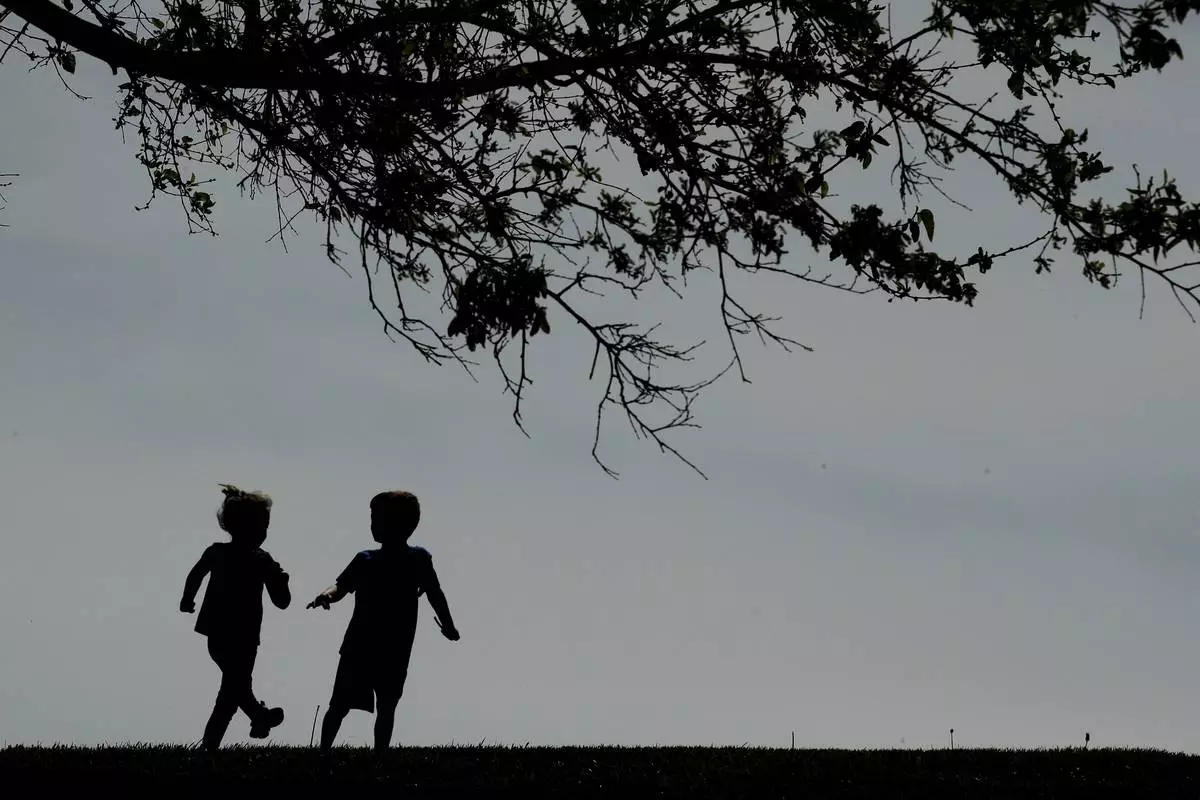 FILE - Children run on the lawn at the Liberty Memorial in Kansas City, Mo., on April 28, 2020. (AP Photo/Charlie Riedel, File)