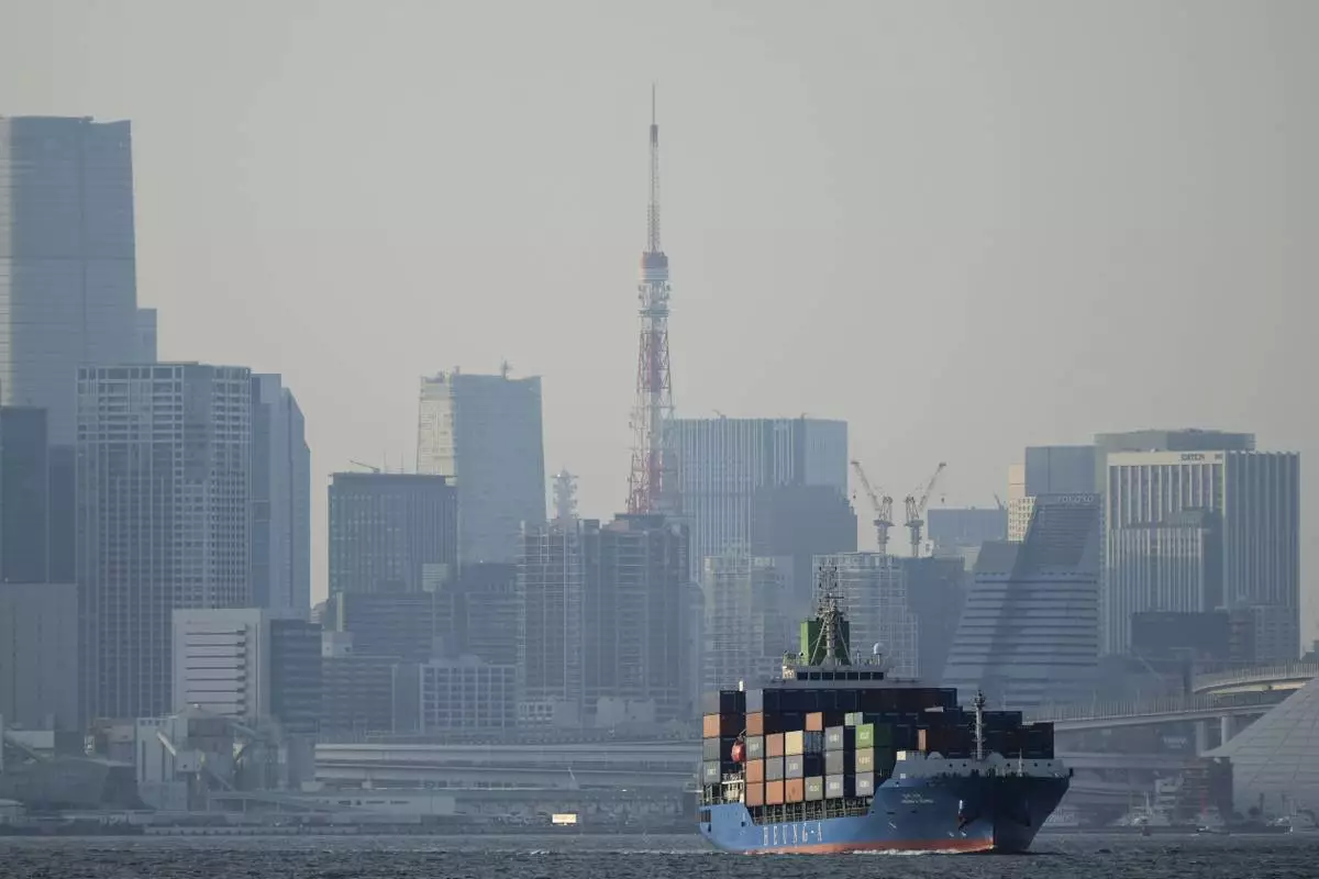 FILE - Tokyo Tower is seen amid tall buildings as a container ship leaves a cargo terminal in Tokyo, April 9, 2025. (AP Photo/Hiro Komae, File)