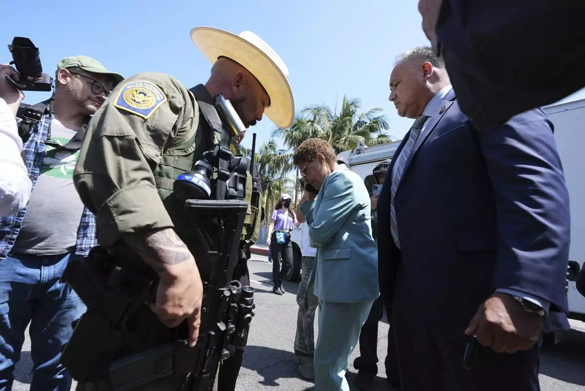 Los Angeles Mayor Karen Bass stands in front of a border patrol federal agent at MacArthur Park Monday, July 7, 2025, in Los Angeles. (AP Photo/Damian Dovarganes)