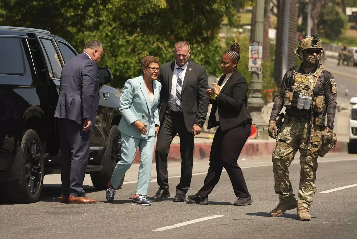 Los Angeles Mayor Karen Bass arrives at MacArthur Park, where federal agents were staging, Monday, July 7, 2025, in Los Angeles. (AP Photo/Damian Dovarganes)