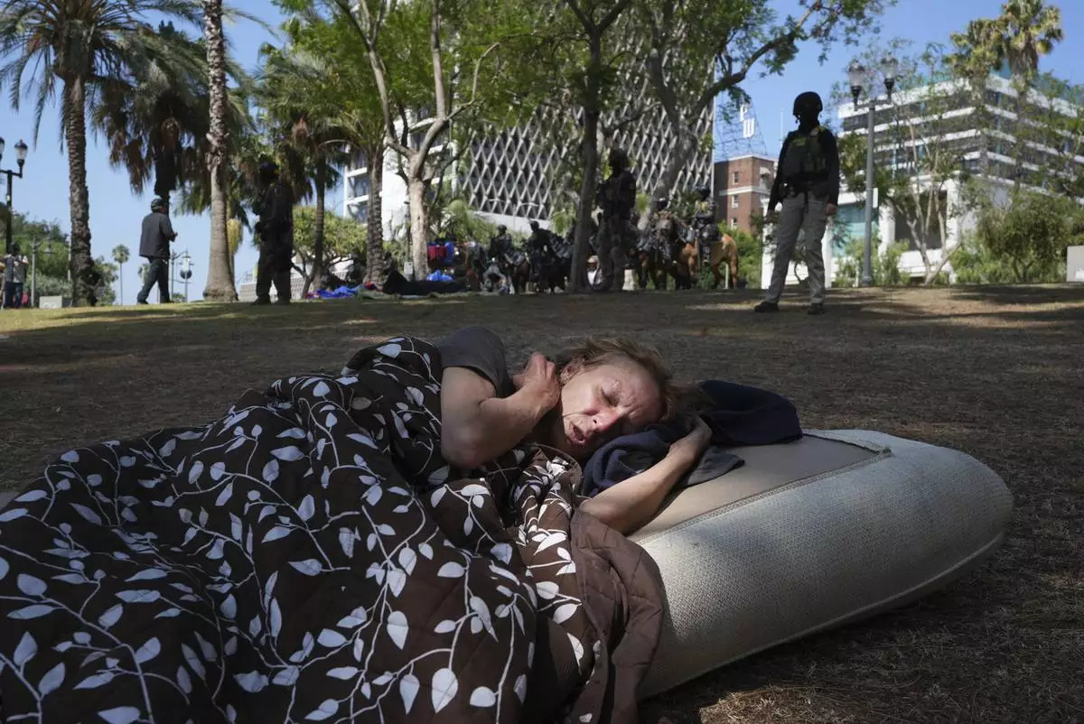A person sleeps on the ground in front of federal agents stage at MacArthur Park Monday, July 7, 2025, in Los Angeles. (AP Photo/Damian Dovarganes)