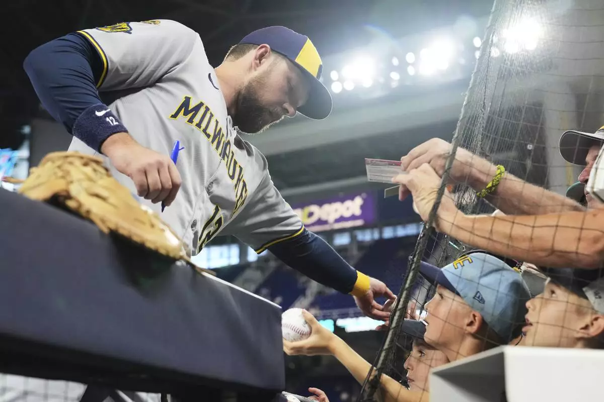 Milwaukee Brewers' Rhys Hoskins signs autographs before a baseball game against the Miami Marlins, Saturday, July 5, 2025, in Miami. (AP Photo/Lynne Sladky)