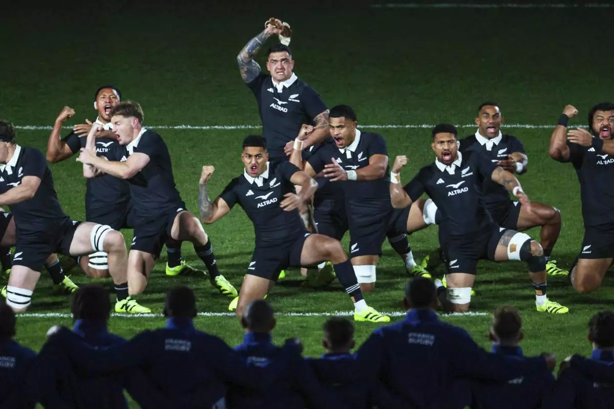 The New Zealand All Blacks perform the haka ahead of their rugby test against France in Dunedin, New Zealand, Saturday, July 5, 2025. (Marty Melville/Photosport via AP)