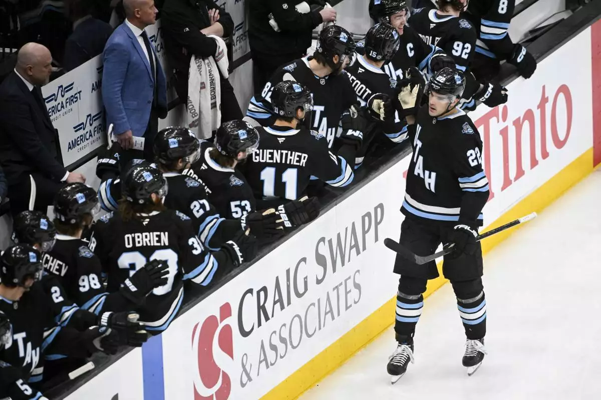FILE - Utah Hockey Club center Jack McBain (22) celebrates a goal during the first period of an NHL hockey game against the Anaheim Ducks, Wednesday, March 12, 2025, in Salt Lake City. (AP Photo/Alex Goodlett, File)