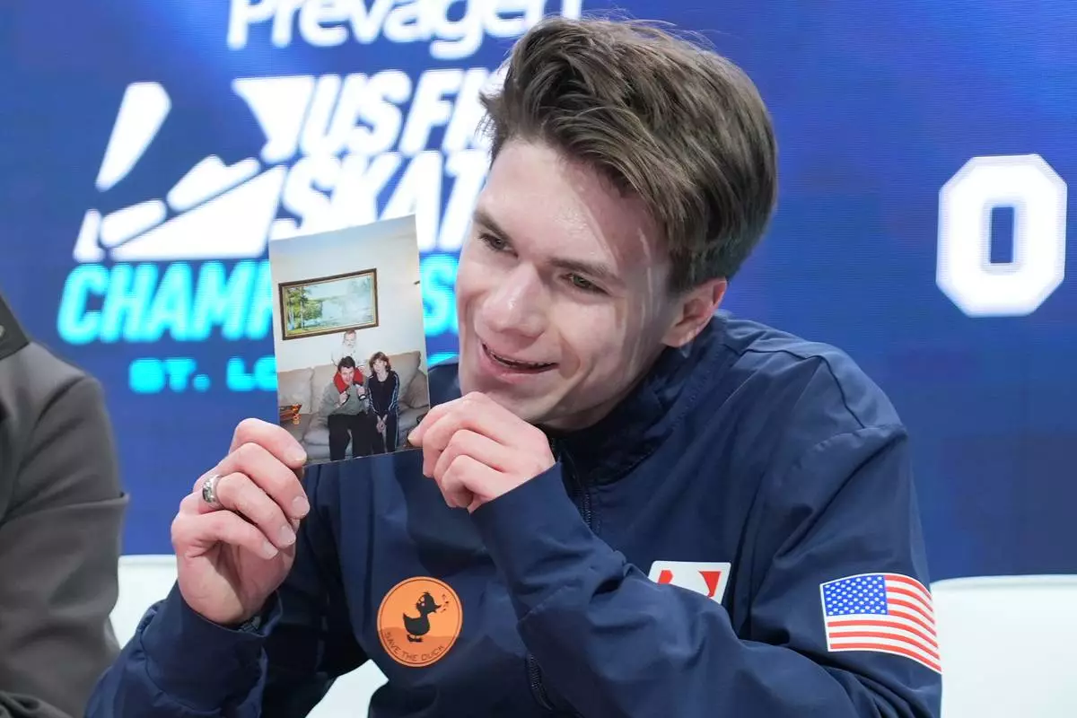 Maxim Naumov holds a photo of his parents after competing during the men's free skate competition at the U.S. Figure Skating Championships, Saturday, Jan. 10, 2026, in St. Louis. (AP Photo/Stephanie Scarbrough)