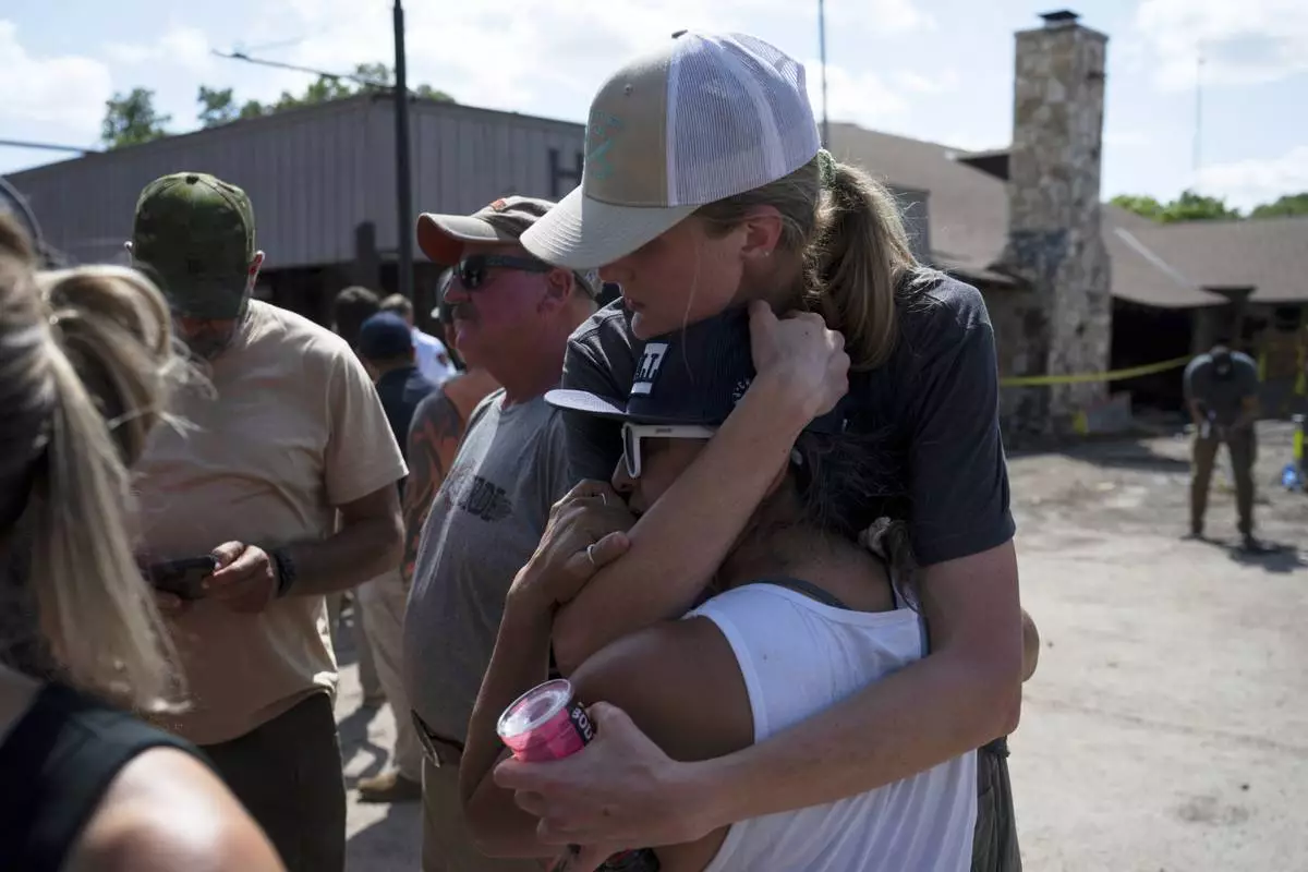 Volunteers helping in search and recovery efforts embrace during a press conference on Tuesday, July 8, 2025, in Hunt, Texas. (AP Photo/Eli Hartman)