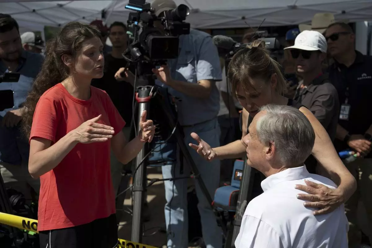 Courtney Calhoun, a resident in Kerr County, left, and Renee DeRese, top right, confront Texas Gov. Greg Abbott on Tuesday, July 8, 2025, in Hunt, Texas. (AP Photo/Eli Hartman)