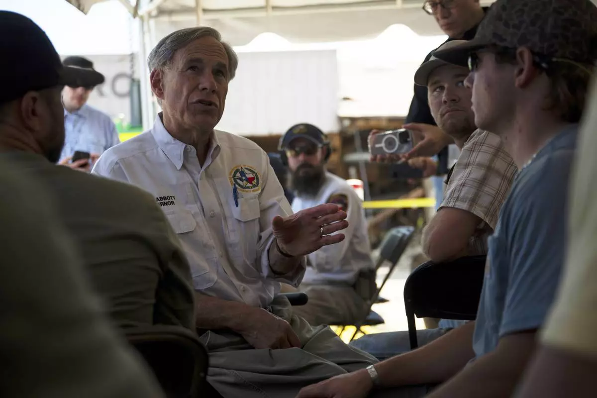 Texas Gov. Greg Abbott speaks to residents and volunteers before a press conference on Tuesday, July 8, 2025, in Hunt, Texas. (AP Photo/Eli Hartman)