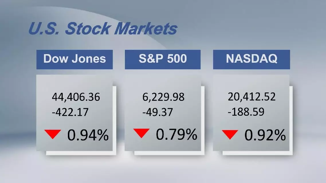 The Dow Jones Industrial Average fell 422.17 points, or 0.94 percent, to 44,406.36. The Standard and Poor's 500 sank 49.37 points, or 0.79 percent, to 6,229.98. The Nasdaq Composite Index shed 188.59 points, or 0.92 percent, to 20,412.52.