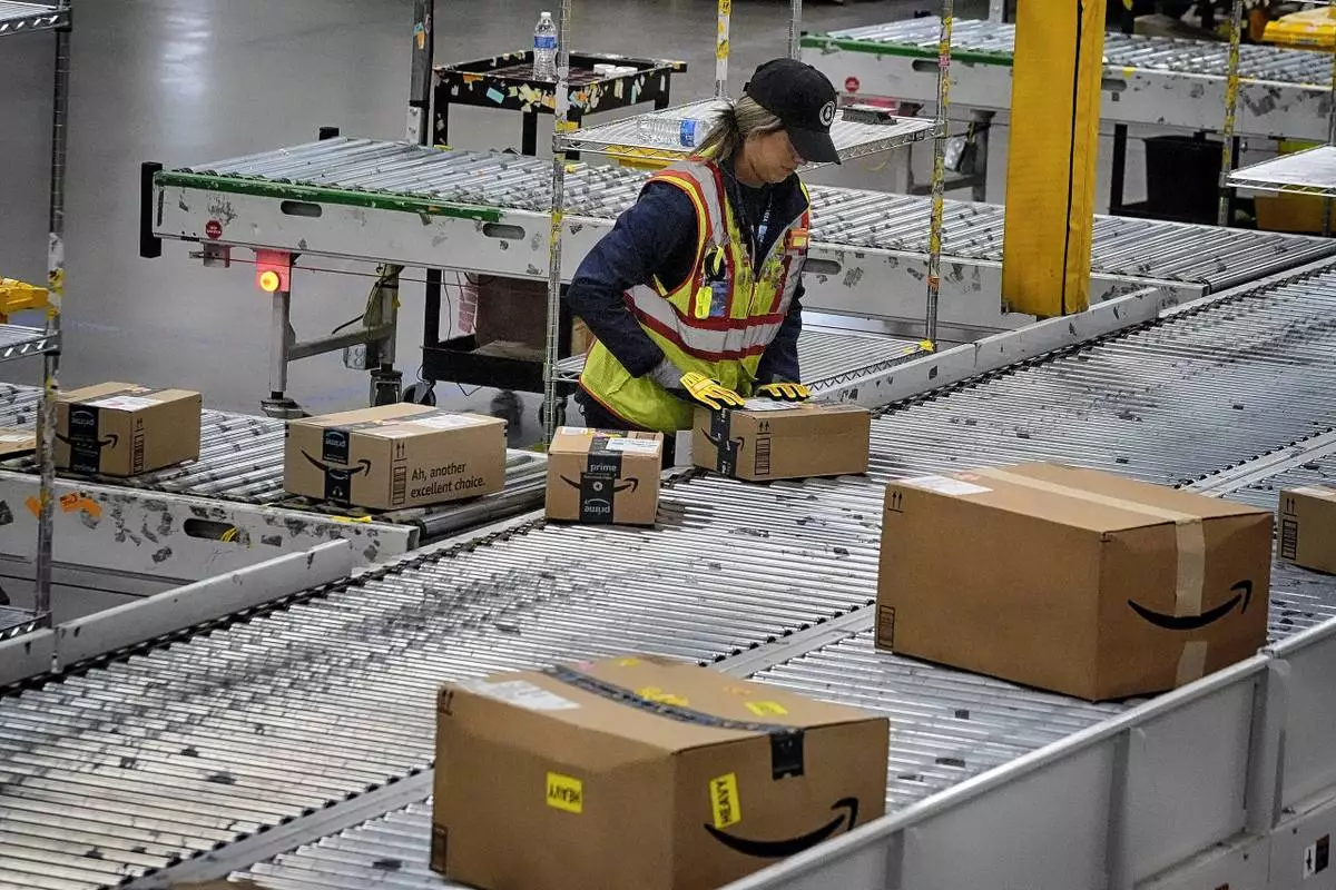 FILE - An Amazon employee puts packages on to a conveyor belt at an Amazon's DAX7 delivery station during Amazon's annual Prime Day event, July 16, 2024, in South Gate, Calif. (AP Photo/Richard Vogel, File)