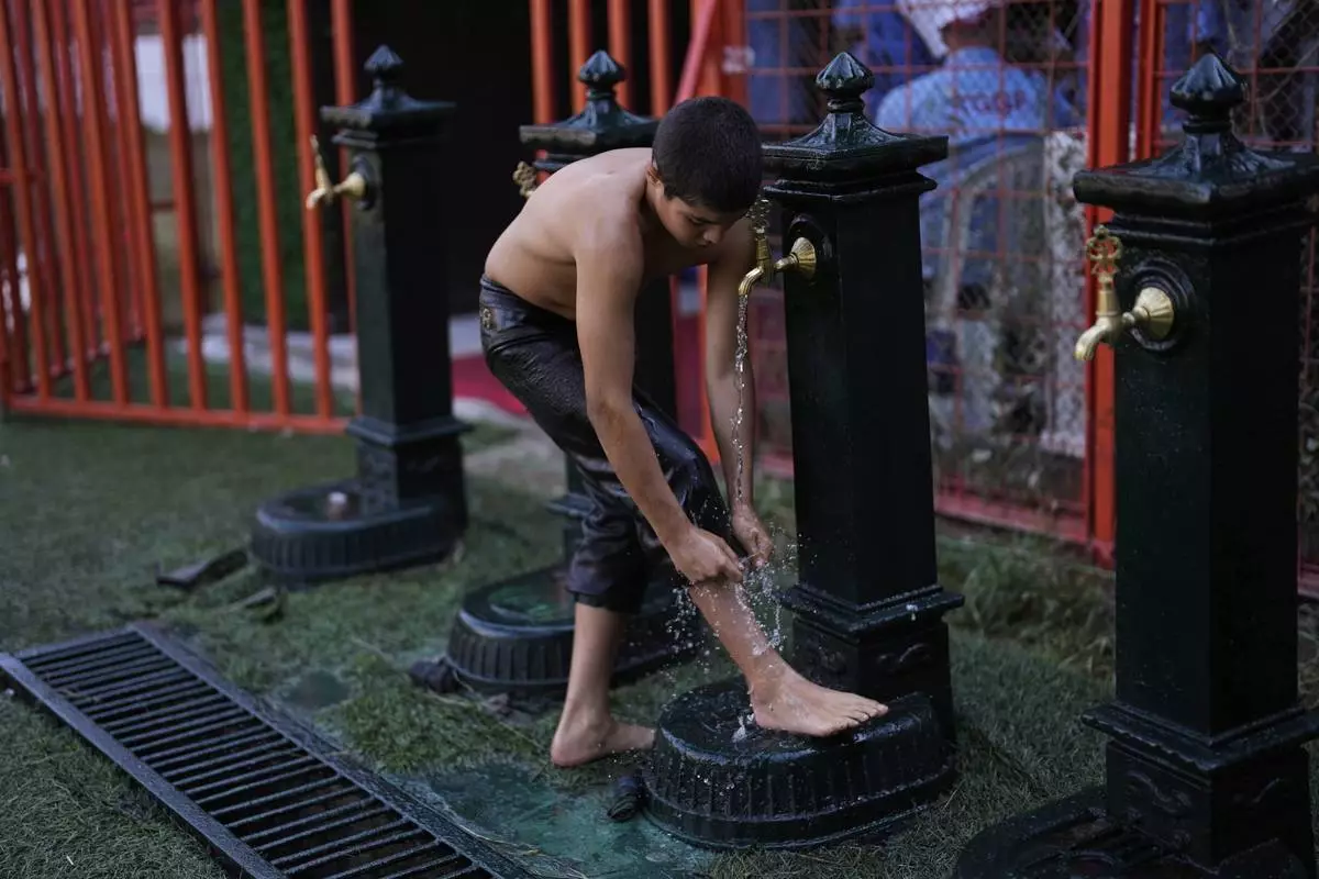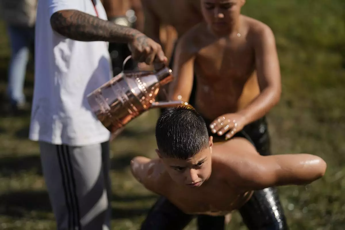A young wrestler washes his body with water before around during the 664th annual Historic Kirkpinar Oil Wrestling championship, in Edirne, northwestern Turkey, Sunday, July 6, 2025. (AP Photo/Khalil Hamra)