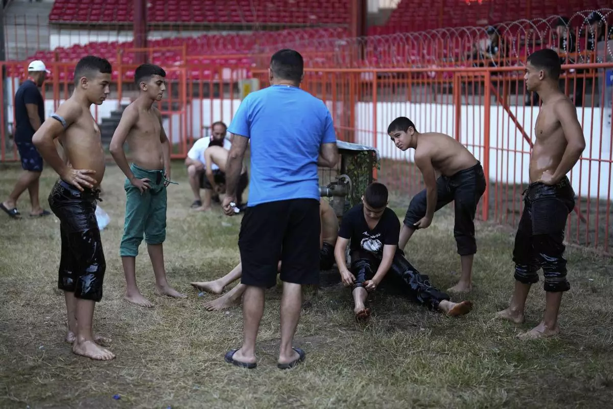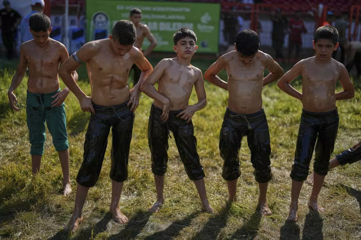 Young wrestlers prepare as they wait for their turn to compete during the 664th annual Historic Kirkpinar Oil Wrestling Championship, in Edirne, northwestern Turkey, Sunday, July 6, 2025. (AP Photo/Khalil Hamra)