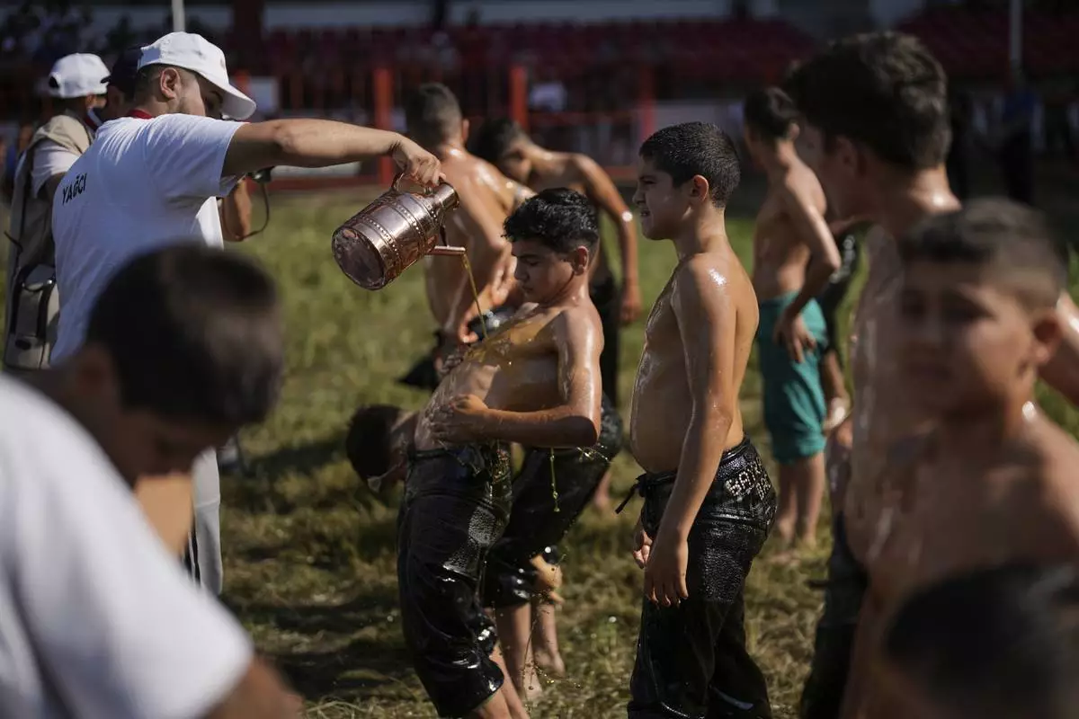 A young wrestler is doused in oil during the 664th annual Historic Kirkpinar Oil Wrestling championship, in Edirne, northwestern Turkey, Sunday, July 6, 2025.(AP Photo/Khalil Hamra)