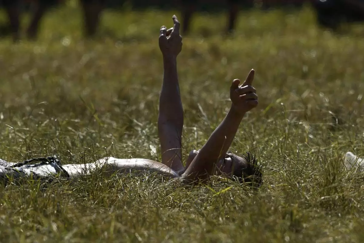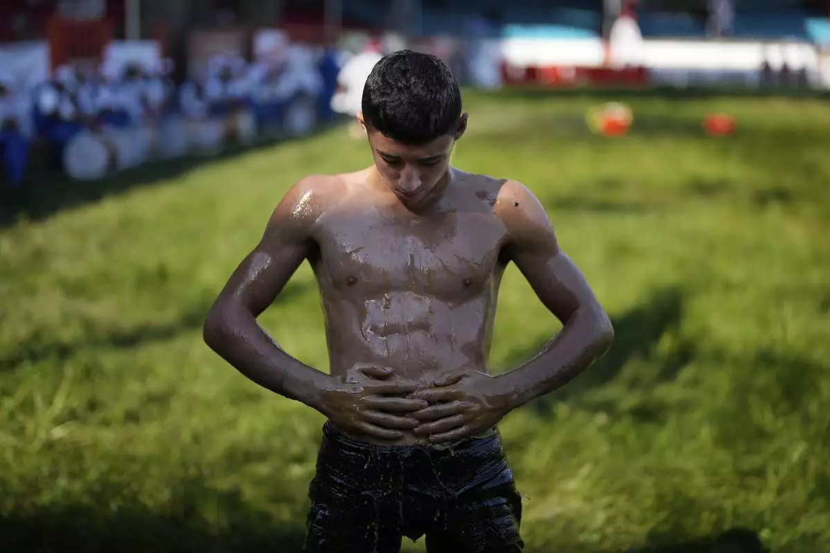 A young wrestler rests after a round during the 663rd annual Historic Kirkpinar Oil Wrestling championship, in Edirne, northwestern Turkey, Sunday, July 6, 2025.(AP Photo/Khalil Hamra)