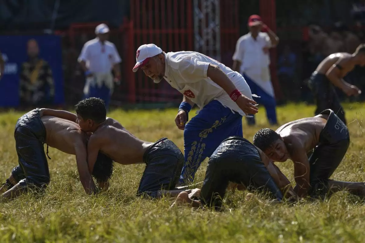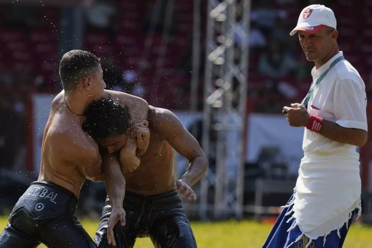 A referee announces the victory of a young wrestler in a round during the 664th annual Historic Kirkpinar Oil Wrestling championship, in Edirne, northwestern Turkey, Sunday, July 6, 2025.(AP Photo/Khalil Hamra)