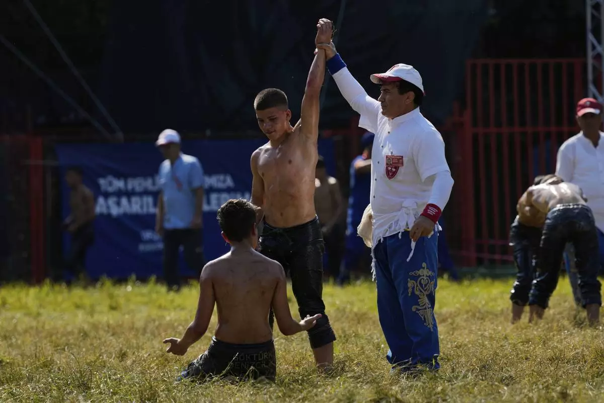 A young wrestler celebrates his victory in a round during the 664th annual Historic Kirkpinar Oil Wrestling championship, in Edirne, northwestern Turkey, Sunday, July 6, 2025.(AP Photo/Khalil Hamra)