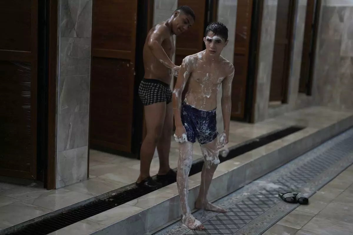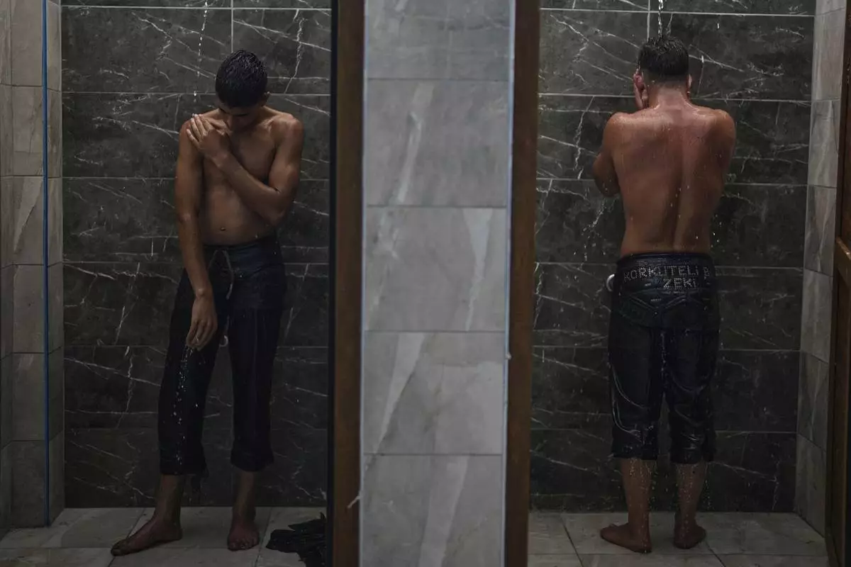 Young wrestlers try to recover on the shower room after they competed on the last day of the 664th annual Historic Kirkpinar Oil Wrestling championship, in Edirne, northwestern Turkey, Sunday, July 6, 2025.(AP Photo/Khalil Hamra)